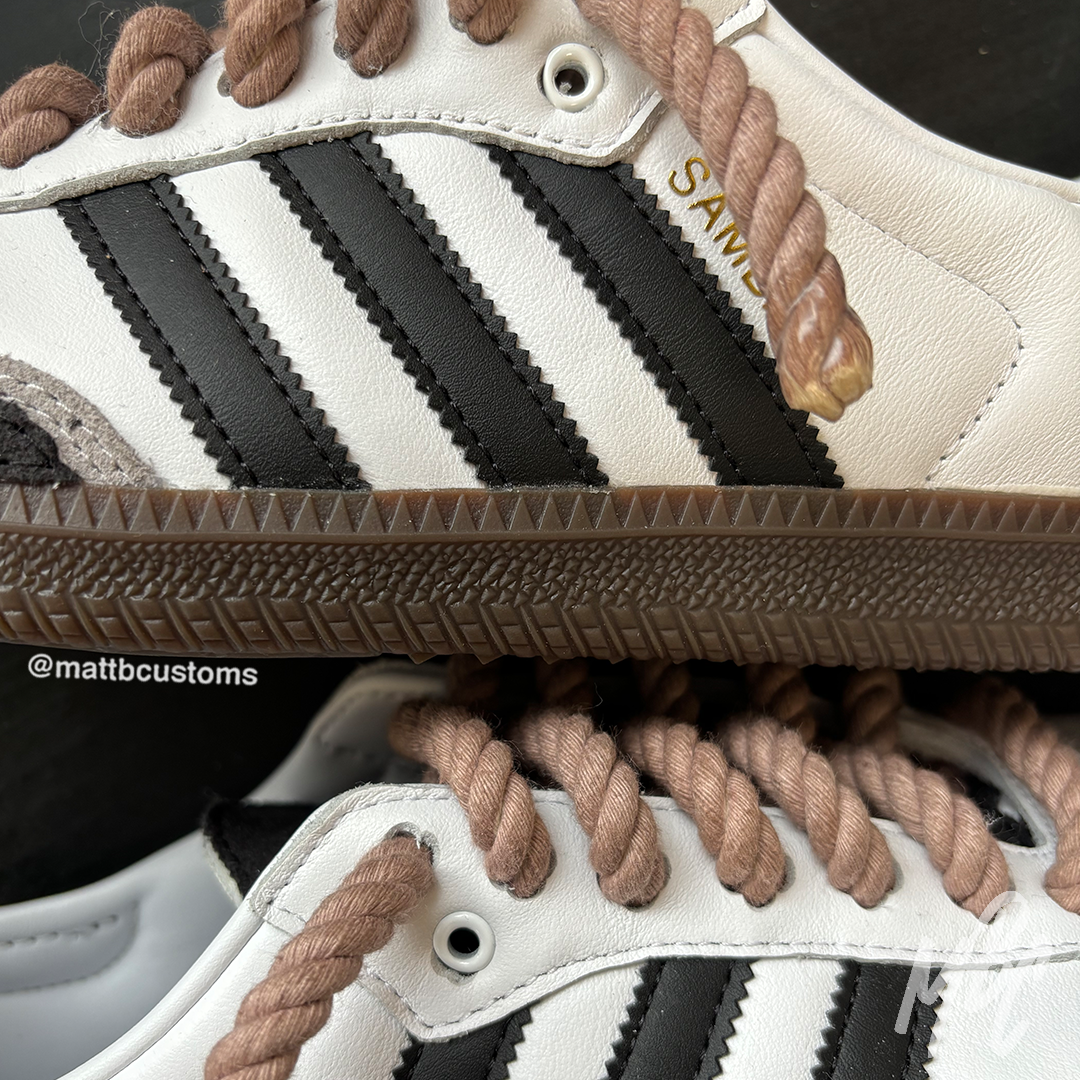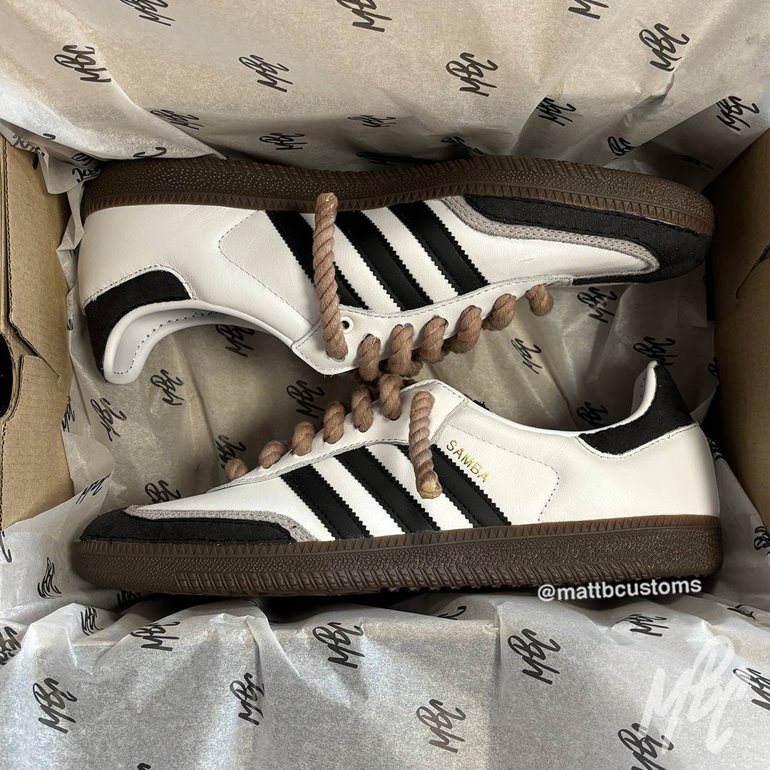 Adidas Samba's with black suede material cut, glued and sewn to the toe area, heel and tongue. Brown thicc laces are added with the ends dipped in plastic to avoid unravelling.