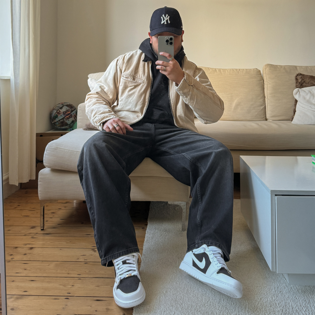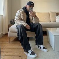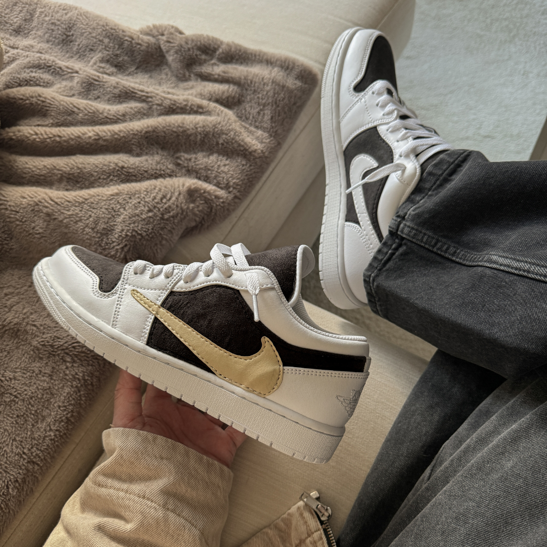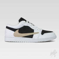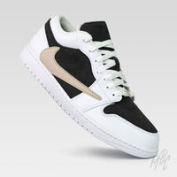 A twist on our best seller Cactus Jogger custom. Black suede material cut, glued and sewn to the swoosh boxes, toe boxes and tongue with beige reverse swooshes added to the outside panels of the shoe.