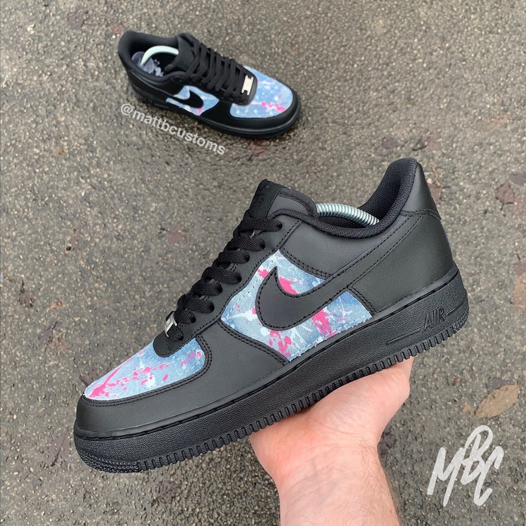 Black Nike Air Force 1 custom with acid wash and paint splat detailed denim fabric, glued and stitched over swoosh panel, toe box and tongue tab.