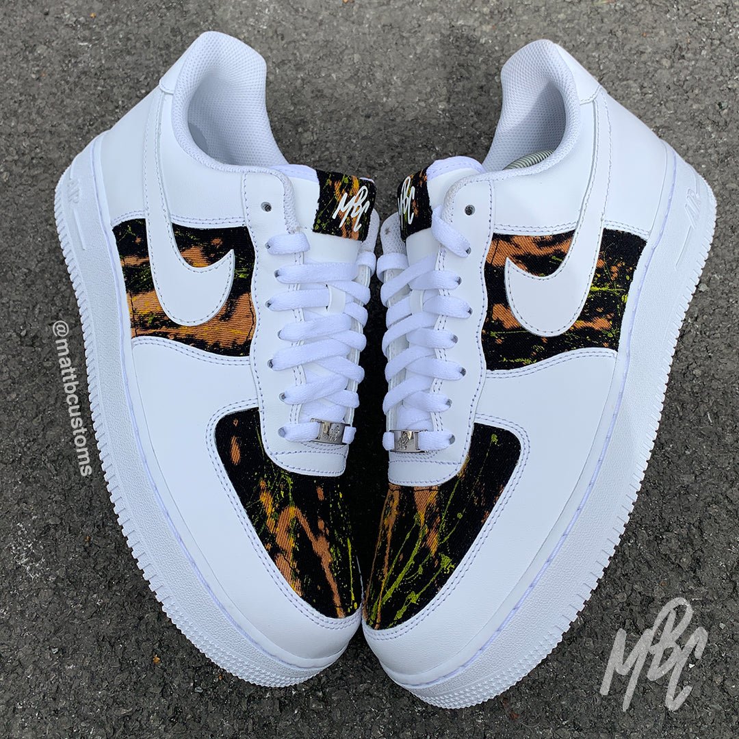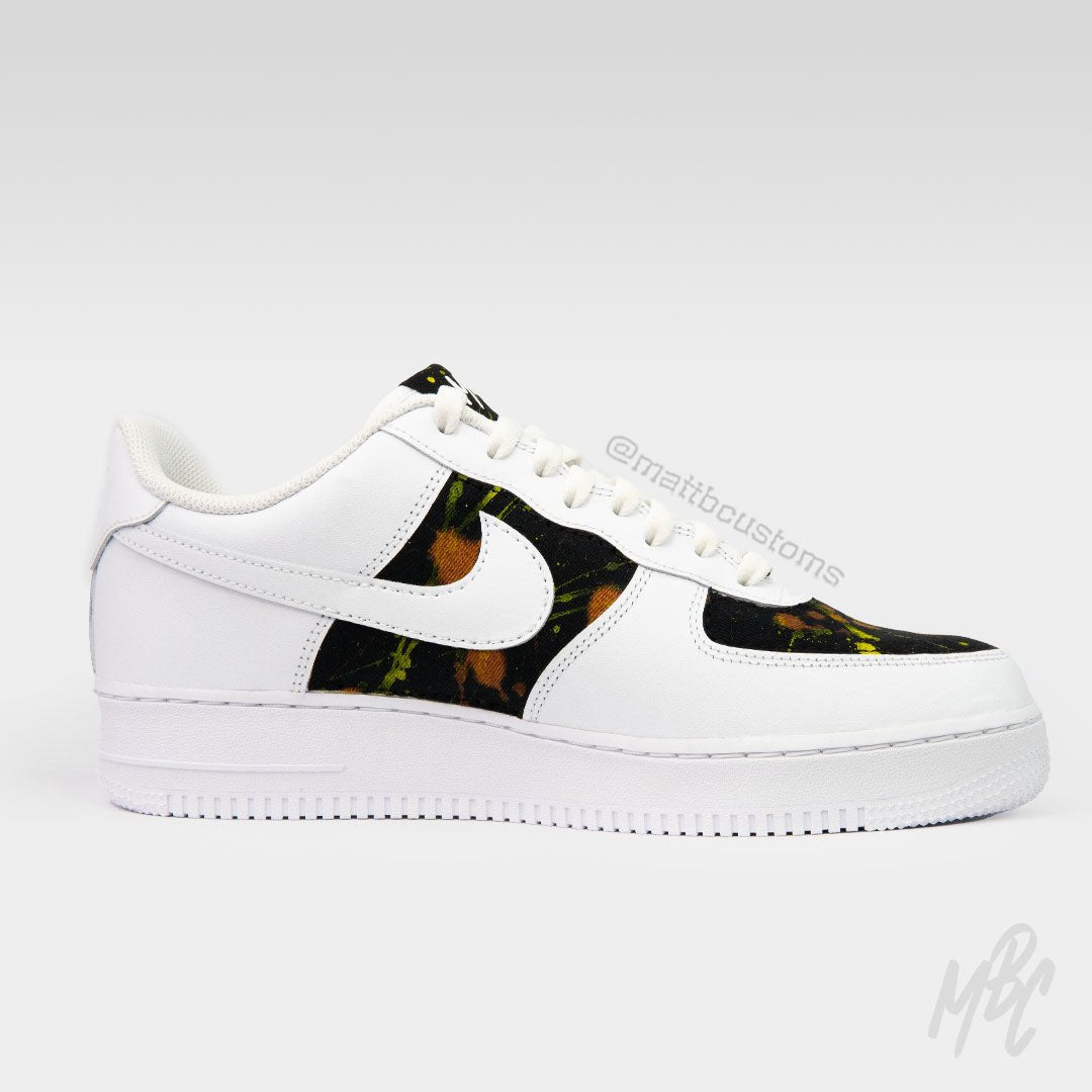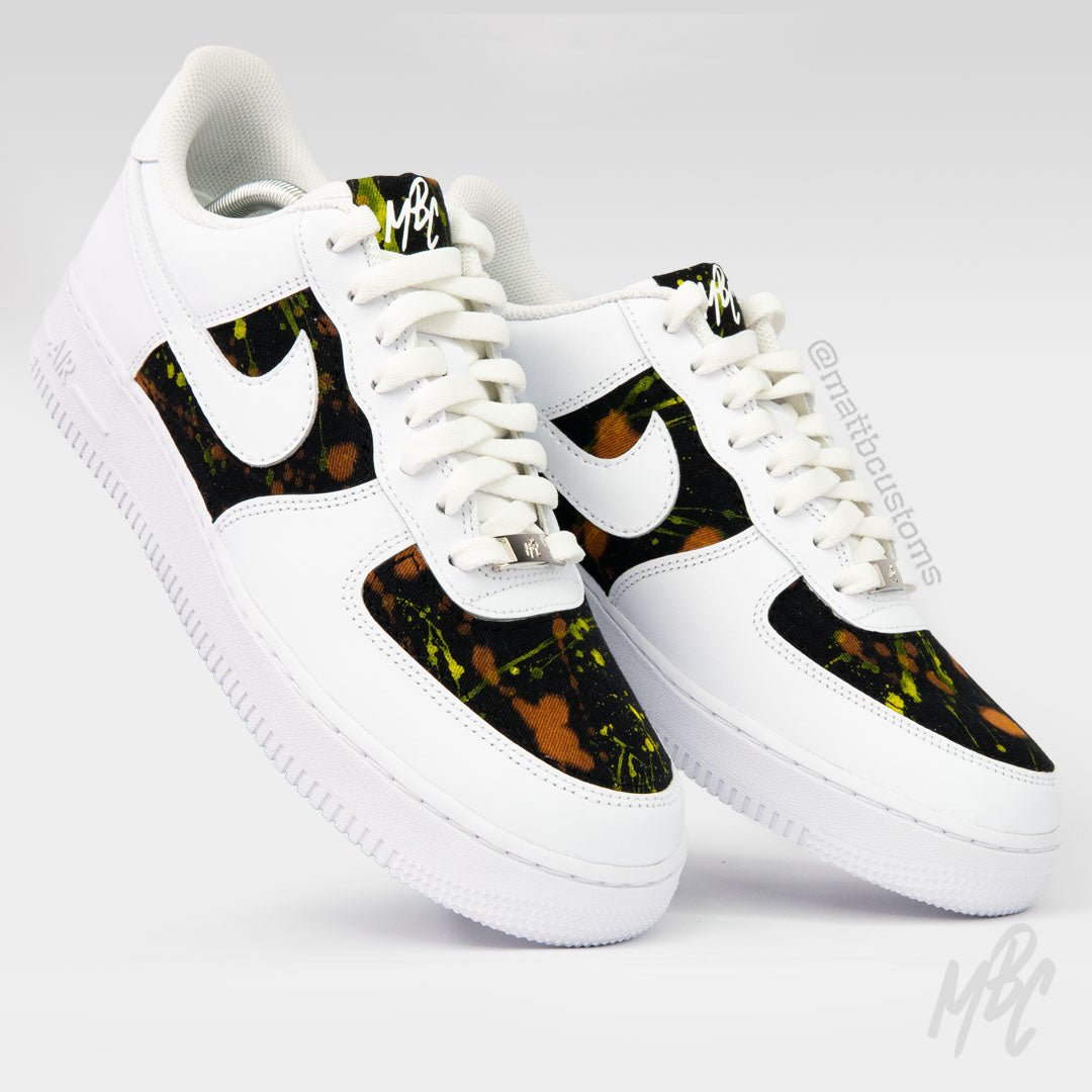 White Nike Air Force 1 custom with black acid wash and paint splat detailed denim fabric.