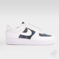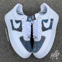 White Nike Air Force 1 custom with blue acid wash and paint splat detailed denim fabric, glued and stitched over swoosh panel, toe box and tongue tab.