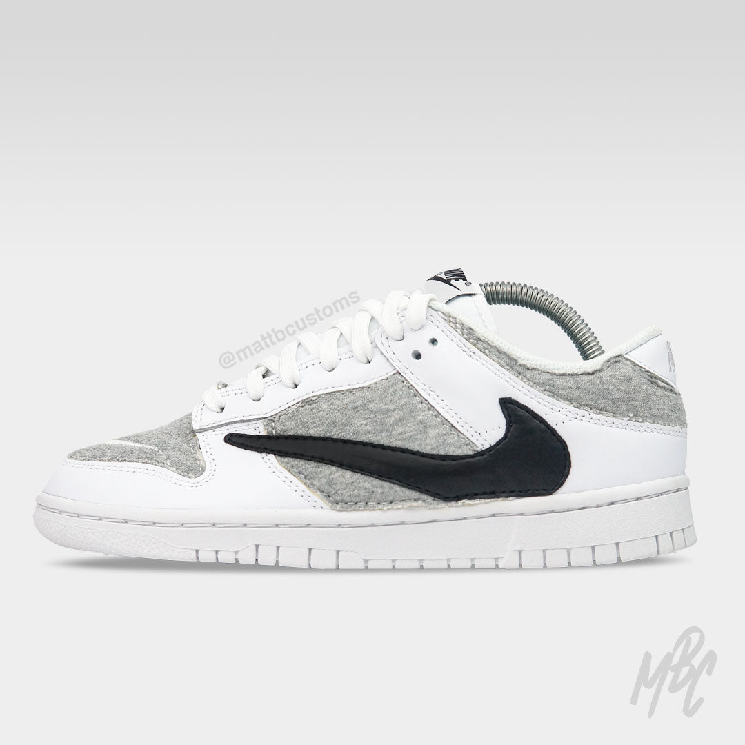 White Dunk Low custom with Joggers material and swoosh embroidery cut, glued and sewn over toe boxes and side panels with a reverse swoosh cut and sewn over the outside of both shoes.