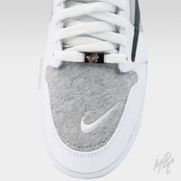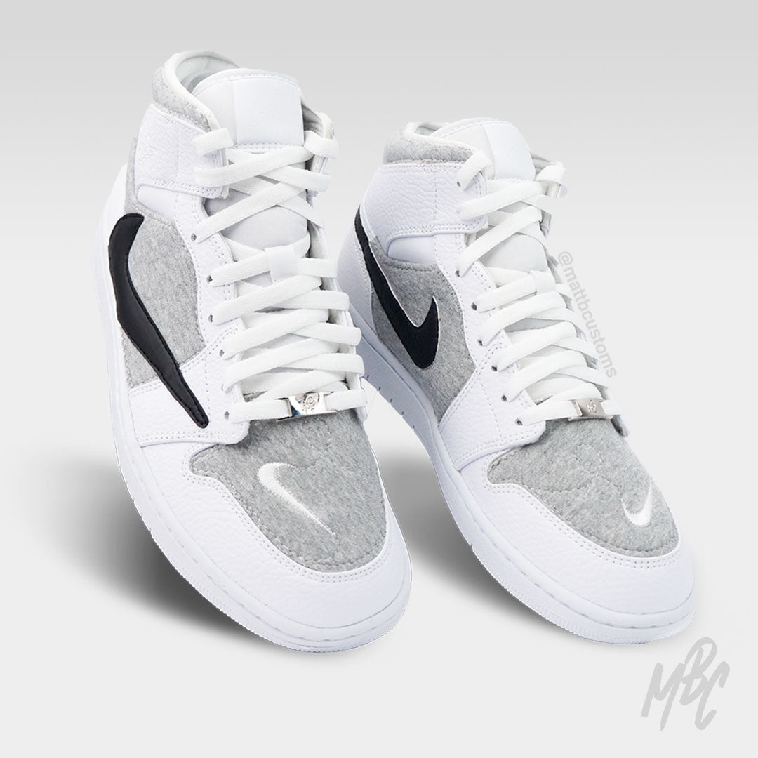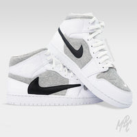 White Jordan 1 Mid custom with Joggers material and swoosh.