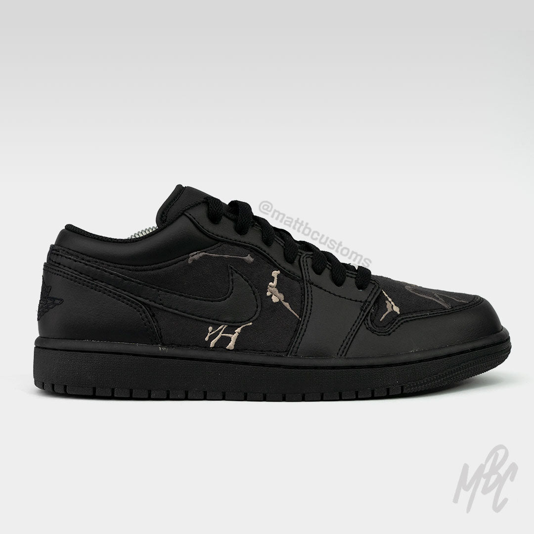 Black or white Jordan 1 Low custom with suede material cut, glued and sewn to the shoe. Suede material is embroidered with neutral tone paint splats.
