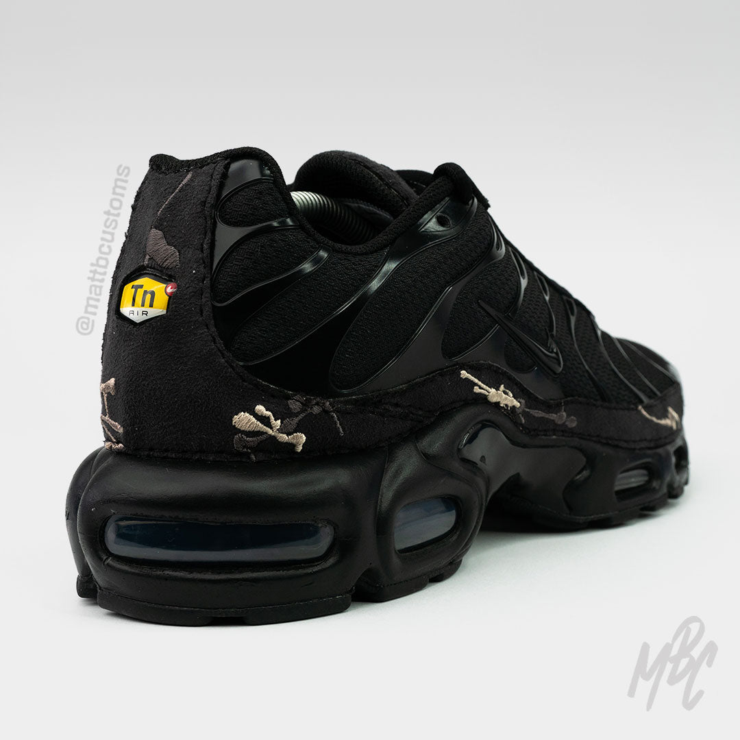 Black or white TN custom with suede material cut, glued and sewn to the shoe. Suede material is embroidered with neutral tone paint splats.
