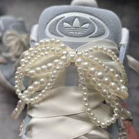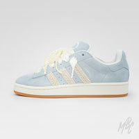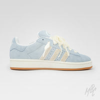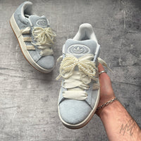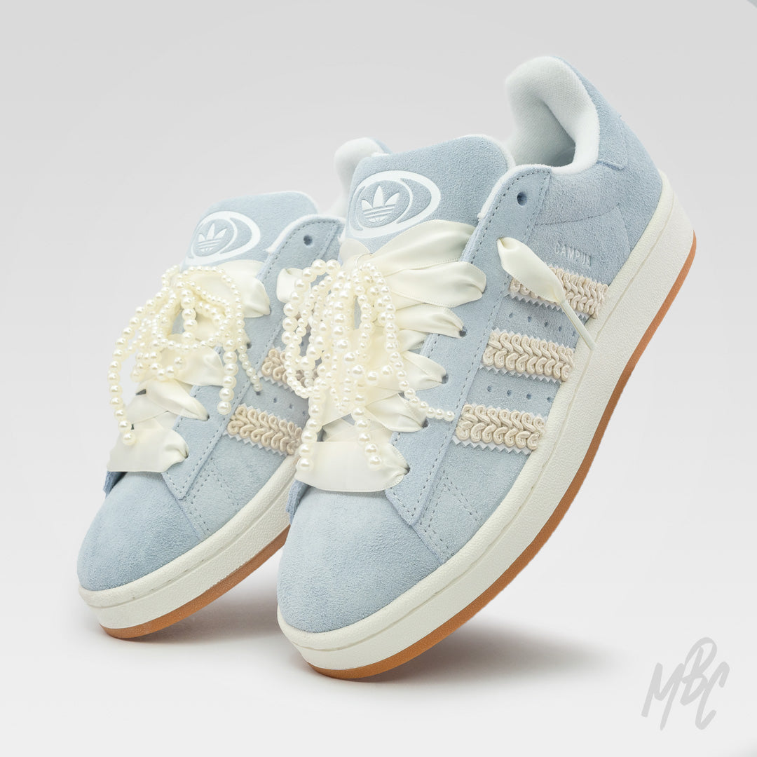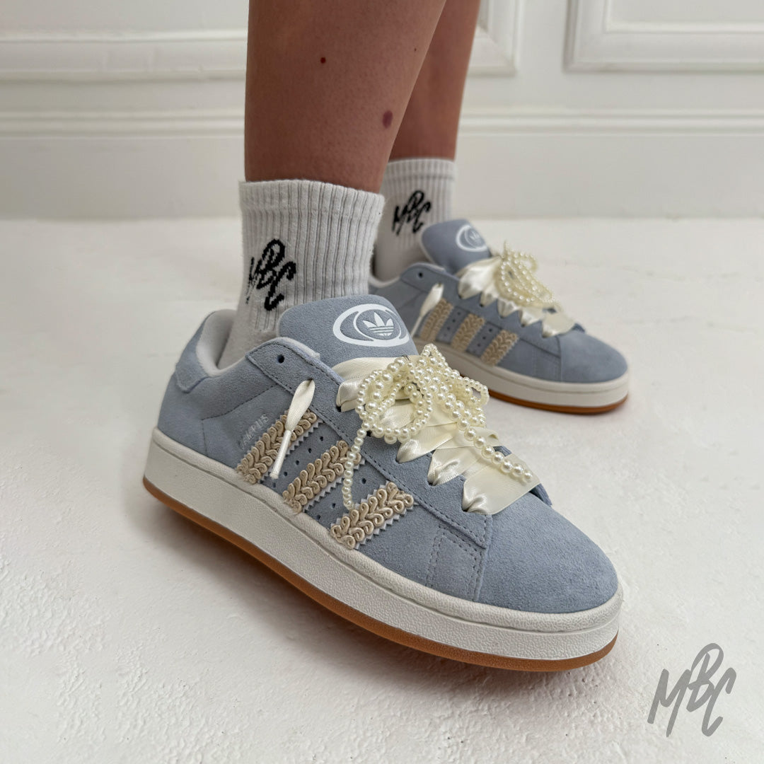 Adidas Campus in pale blue with woven twine sewn over three stripes. Laced with Lacey laces along with a pearl bow accessory.