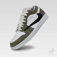 White Jordan 1 Low with sage green suede material cut, glued and sewn to OG panels with a black reverse swoosh added to the outside of each shoe.