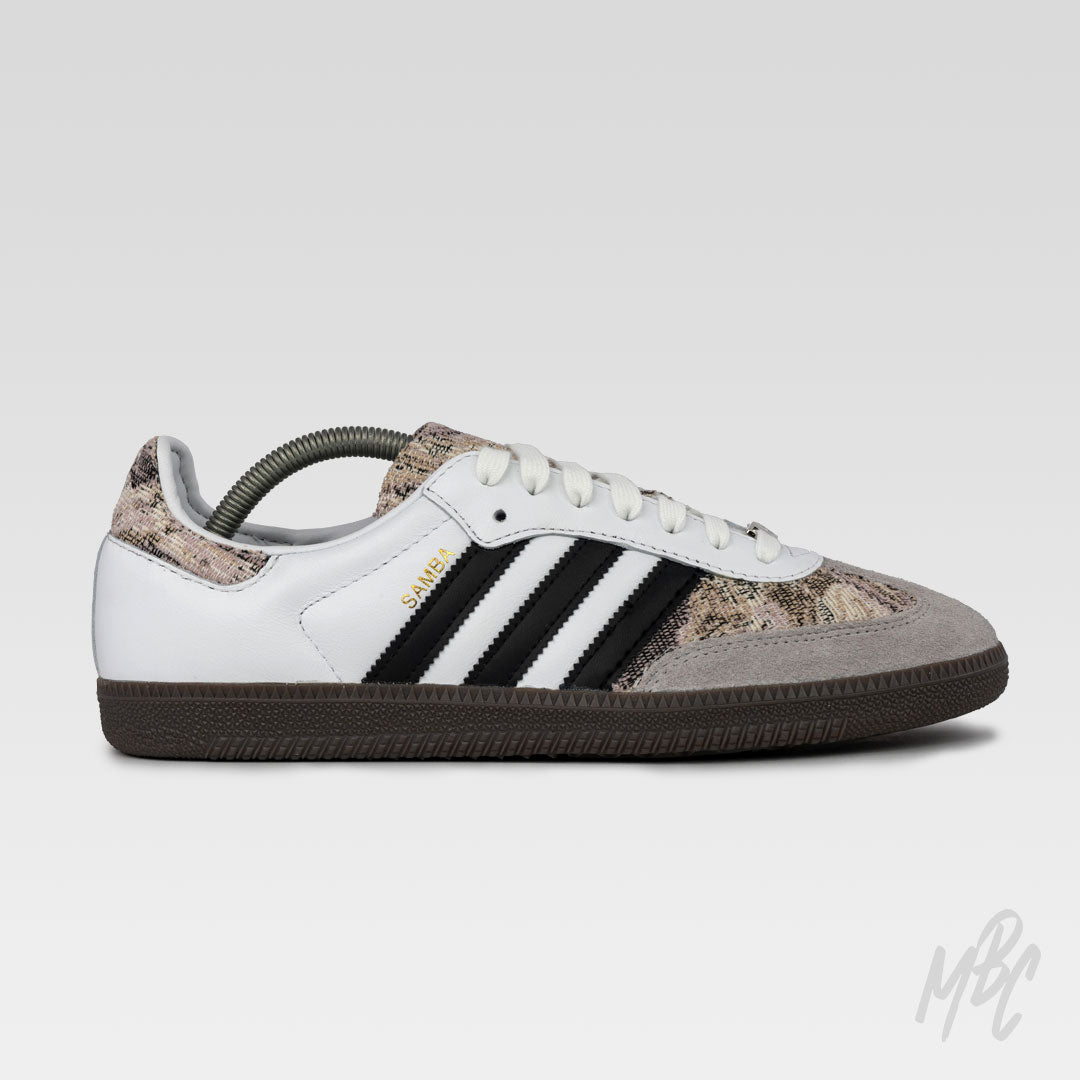 Adidas Samba with vintage carpet material cut, glued and sewn to the toe area, tongue and heel panel.