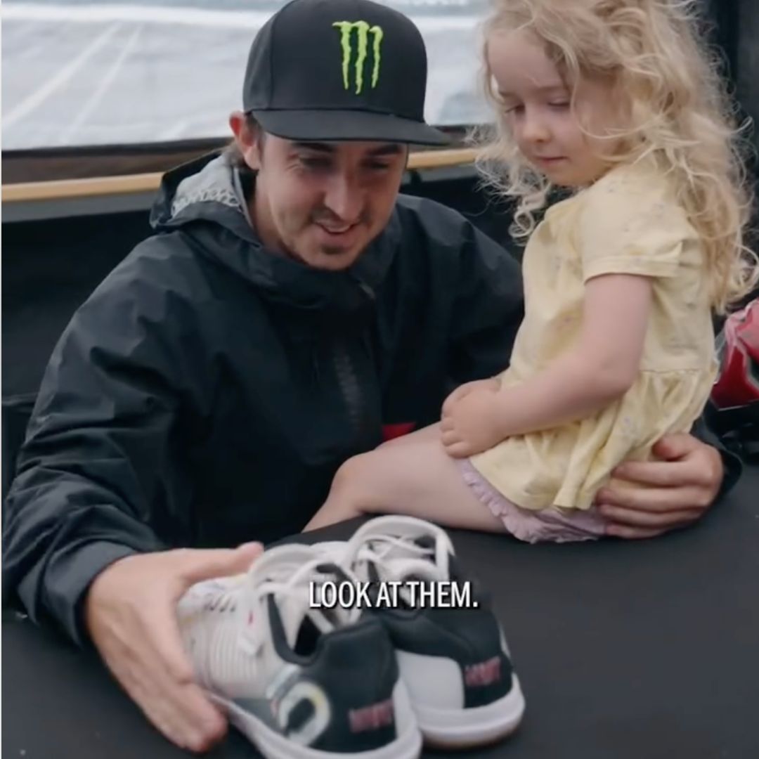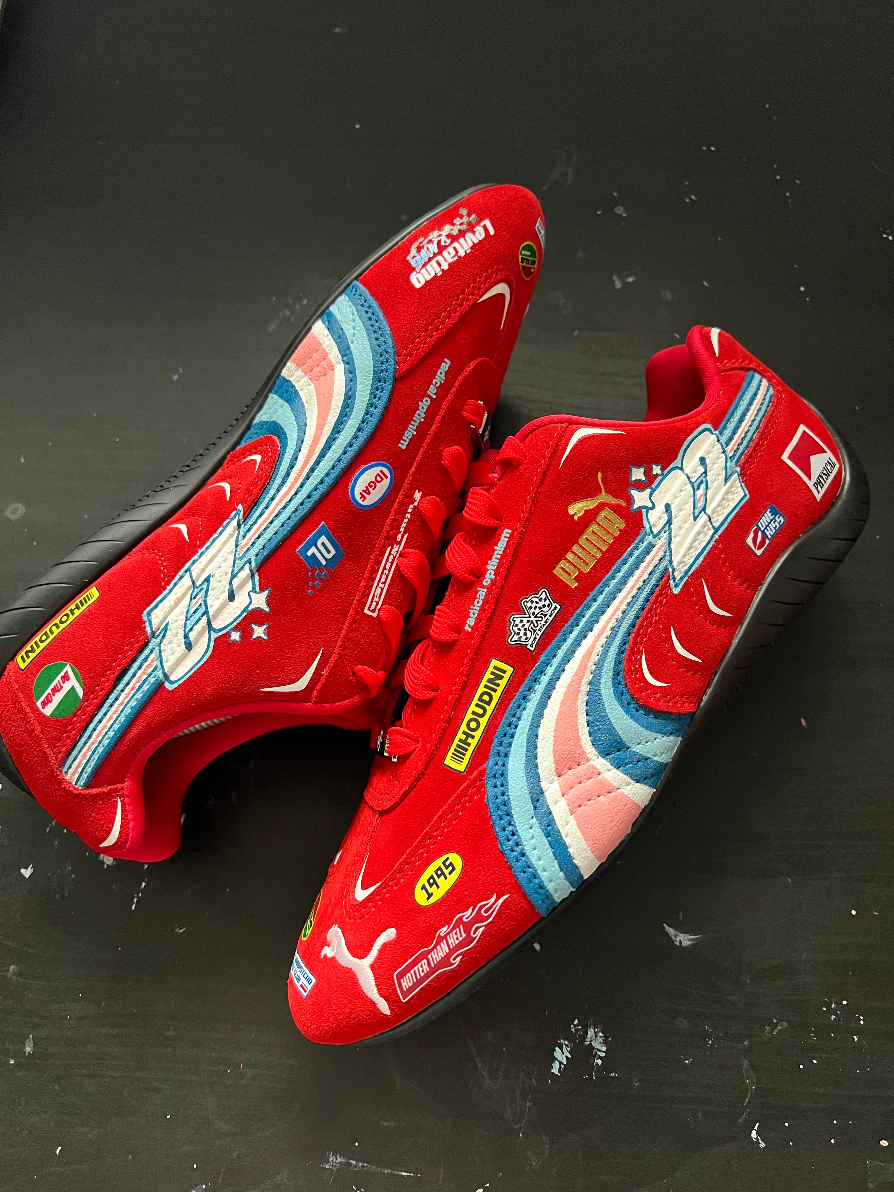 We created a pair of 1of1 Puma Speedcats for Dua Lipa on behalf of Puma & JD which were gifted to her at the launch event of the new Puma Speedcat. The design was inspired by vintage race cars but the sponsor logos were all influenced by her career with names taken from songs, albums & personalised details like her favourite number or where she grew up.
